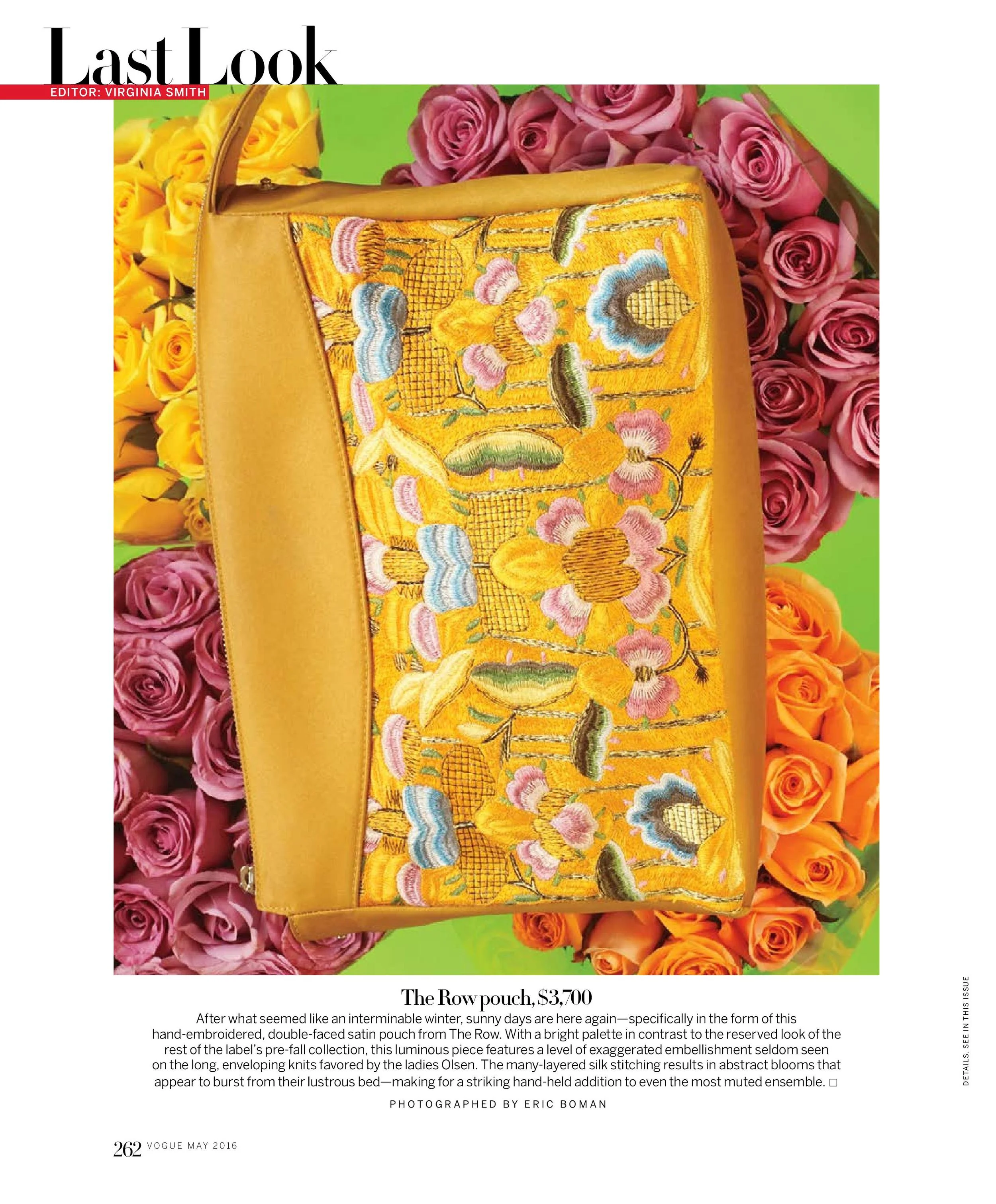 After what seemed like an interminable winter, sunny days are here again—specifically in the form of this hand-embroidered, double-faced satin pouch from The Row. With a bright palette in contrast to the reserved look of the rest of the label's pre-fall collection, this luminous piece features a level of exaggerated embellishment seldom seen on the long, enveloping knits favored by the ladies Olsen. The many-layered silk stitching results in abstract blooms that appear to burst from their lustrous bed—making for a striking hand-held addition to even the most muted ensemble.