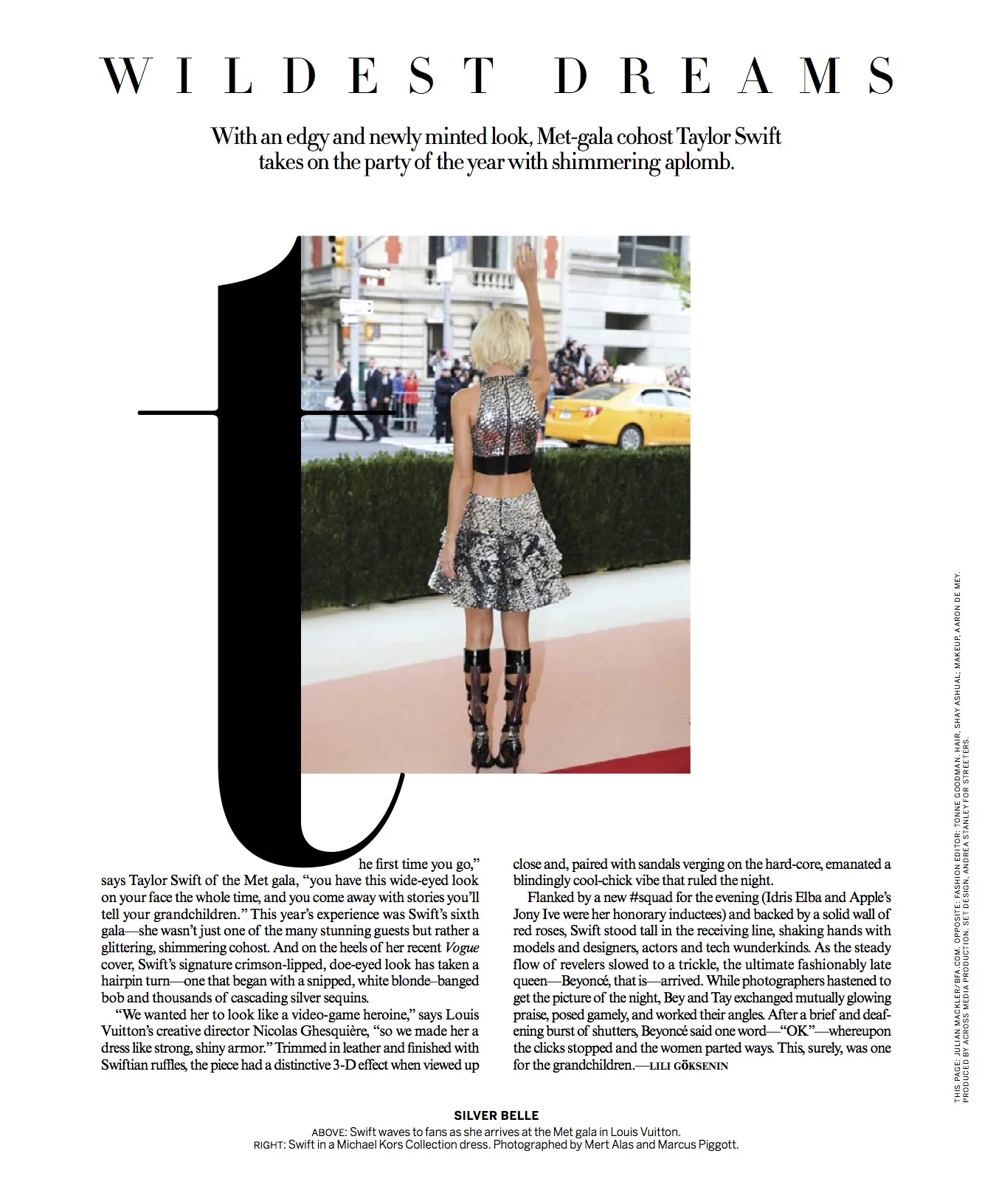 The first time you go,” says Taylor Swift of the Met gala, “you have this wide-eyed look on your face the whole time, and you come away with stories you'll tell your grandchildren.” This year's experience was Swift's sixth gala—she wasn't just one of the many stunning guests but rather a glittering, shimmering cohost. And on the heels of her recent VOGUE cover, Swift's signature crimson-lipped, doe-eyed look has taken a hairpin turn—one that began with a snipped, white blonde-banged bob and thousands of cascading silver sequins.